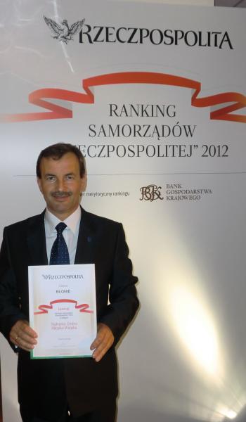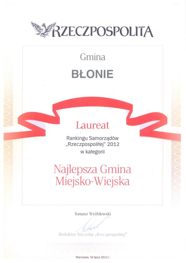 Po raz kolejny Gmina Błonie została wyróżniona jako laureat w Rankingu Samorządów "Rzeczpospolitej" 2012 w kategorii Najlepsza Gmina Miejsko-Wiejska.